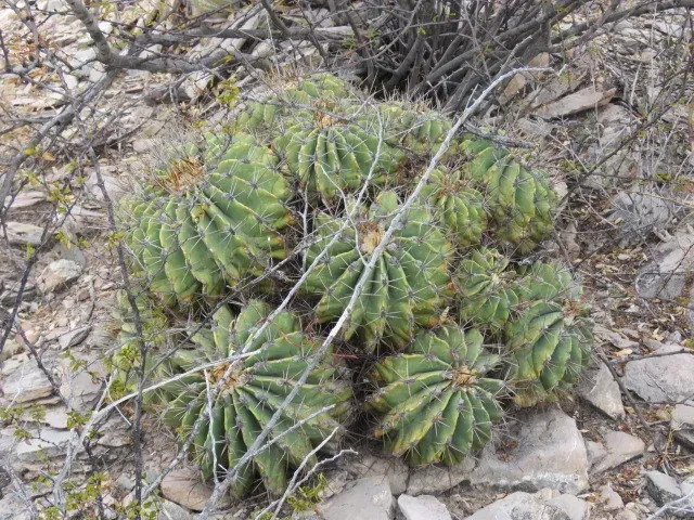 Ferocactus echidne is a medium-sized barrel cactus native to Central Mexico, characterized by its globose to depressed-globose stem and yellow funnel-shaped flowers.