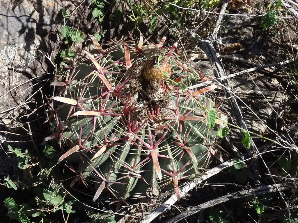 Ferocactus latispinus is a globular or barrel-shaped cactus native to Mexico, known for its broad, flattened spines and distinctive gnarly appearance.