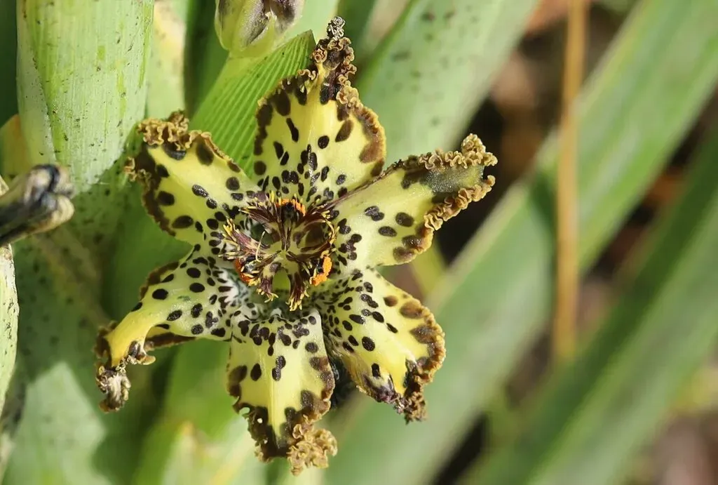 Starfish Iris (Ferraria Crispa) is a perennial bulb in the Iridaceae family with moderate care difficulty. It requires moderate watering and full sun or partial shade light in USDA hardiness zones 9-11. This plant is safe for cats and dogs.