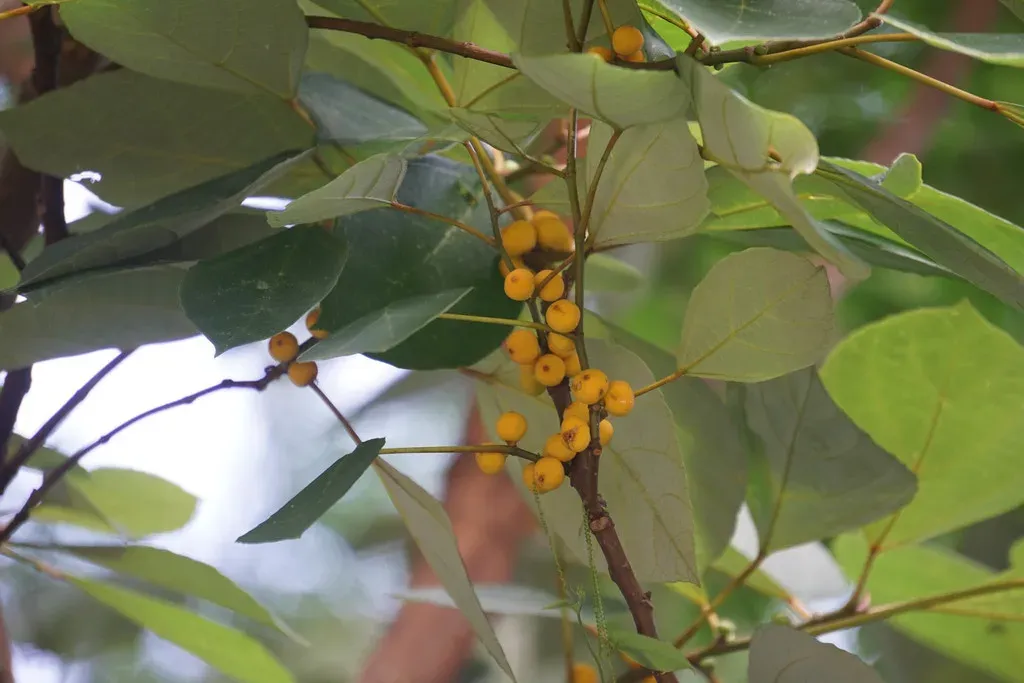 Ficus grossularioides is a shrub or small tree native to Southeast Asia, known for its variable leaf shapes and latex production.