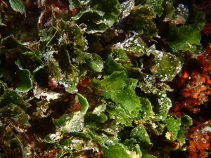 Flabellia petiolata is a green macroalgae species native to the Mediterranean Sea, characterized by its fan-shaped flattened thallus with a petiole and blade.