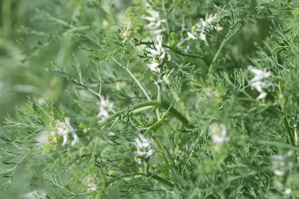 Fineleaf Fumitory (Fumaria Parviflora) is a annual herb in the Papaveraceae family with easy care difficulty. It requires moderate watering and full sun or partial shade light in USDA hardiness zones 6-11. This plant is toxic to cats and dogs — keep it out of reach of pets.