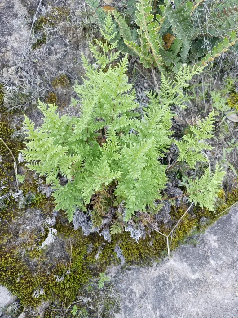 Kaulfuss' Lipfern (Gaga Kaulfussii) is a perennial fern in the Pteridaceae family with moderate care difficulty. It requires moderate watering and partial shade or filtered_light light in USDA hardiness zones 7-10. This plant is safe for cats and dogs.
