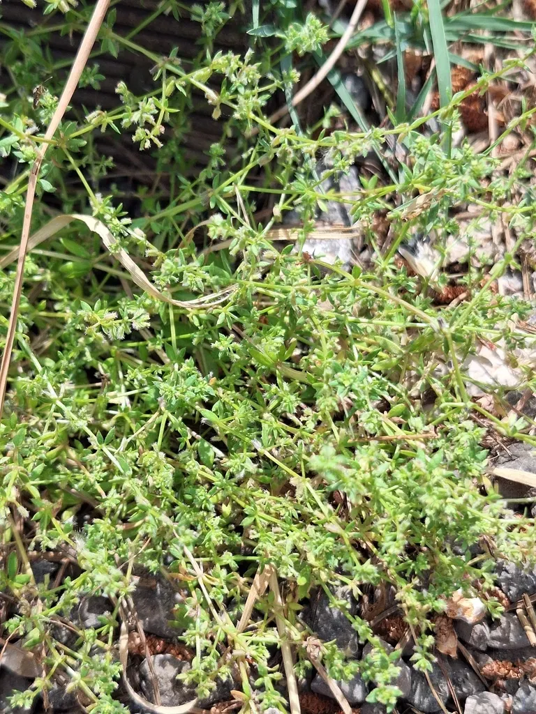 Galium murale is a small annual herbaceous plant in the Rubiaceae family, characterized by slender, erect to spreading stems, small whorled leaves, and tiny greenish-yellow flowers.