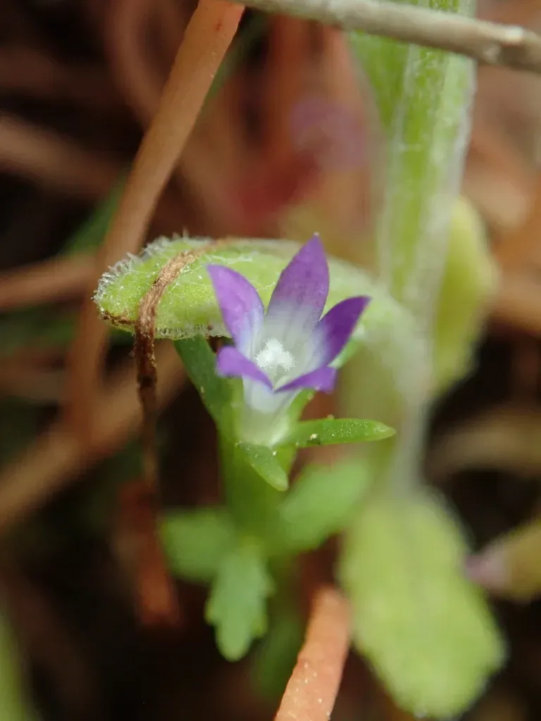Githopsis specularioides is an annual herb native to California and western North America, characterized by its small size and blue cup-shaped flowers.