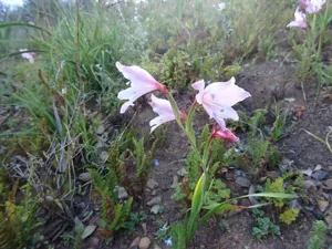 Gladiolus carneus is a cormous perennial plant native to southern Africa, known for its ornamental funnel-shaped flowers with distinctive dark markings.