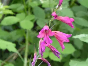 Gladiolus communis is a vigorous herbaceous perennial growing up to 1 meter tall with linear leaves and bright pink to magenta flowers.