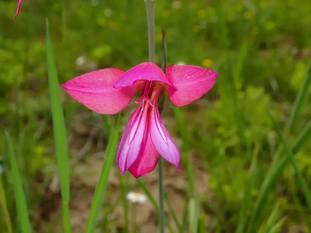 Gladiolus italicus is a perennial flowering plant known for its bright pink to magenta flowers arranged in loose spikes.