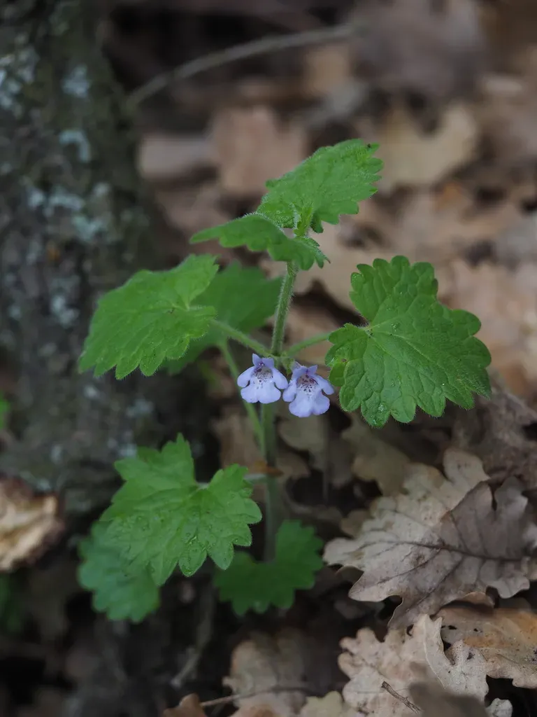 Glechoma hirsuta is a perennial herbaceous plant with a creeping growth habit and hairy, scalloped leaves.