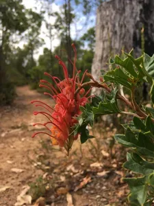 A spreading, lignotuberous shrub native to southwestern Australia, known for its deeply divided fern-like leaves and vibrant orange-red flowers that attract nectar-feeding birds.