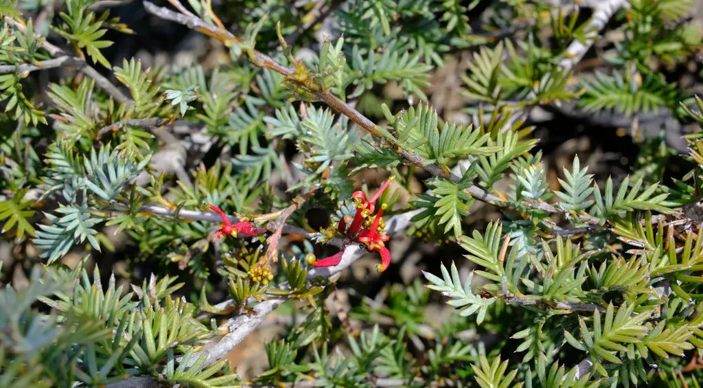 Grevillea huegelii is an erect to low-lying shrub endemic to southern Australia, known for its divided leaves with sharply-pointed linear lobes and clusters of red to pink flowers.