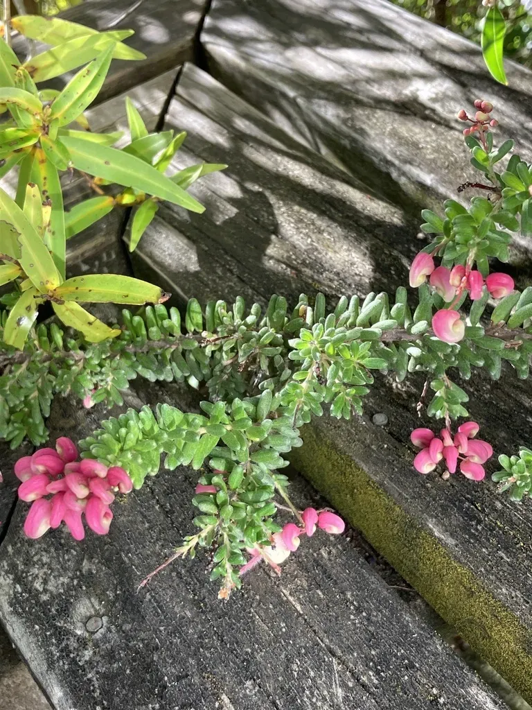 A spreading evergreen shrub native to Australia with narrow linear leaves and clusters of pink to red and cream-colored flowers.