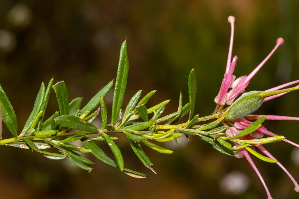 A small, spreading Australian native shrub with fine, aromatic foliage and clusters of pink to red spider-like flowers.