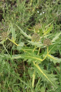 Gundelia tournefortii is a spiny perennial herbaceous plant native to the Middle East, known for its edible young shoots and flowering heads.
