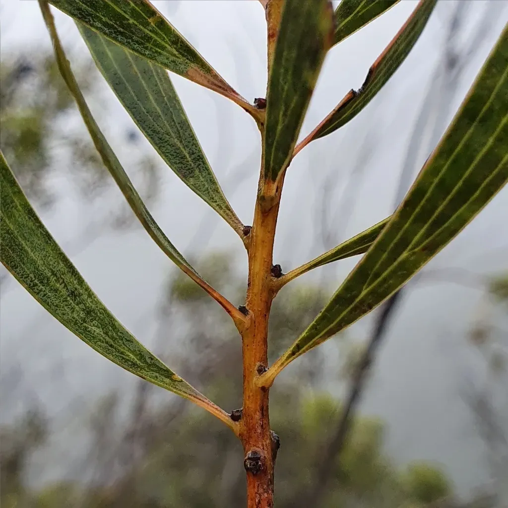 Hakea dactyloides is a small to medium shrub or small tree with an upright habit, known for its narrow-lanceolate to oblong leaves and white flowers.