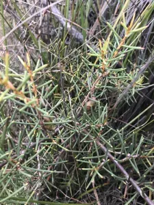 Hakea rugosa is a dense, divaricate shrub native to southern Australia, growing up to 2.5 meters tall with prickly, needle-shaped leaves and white hairy branchlets.