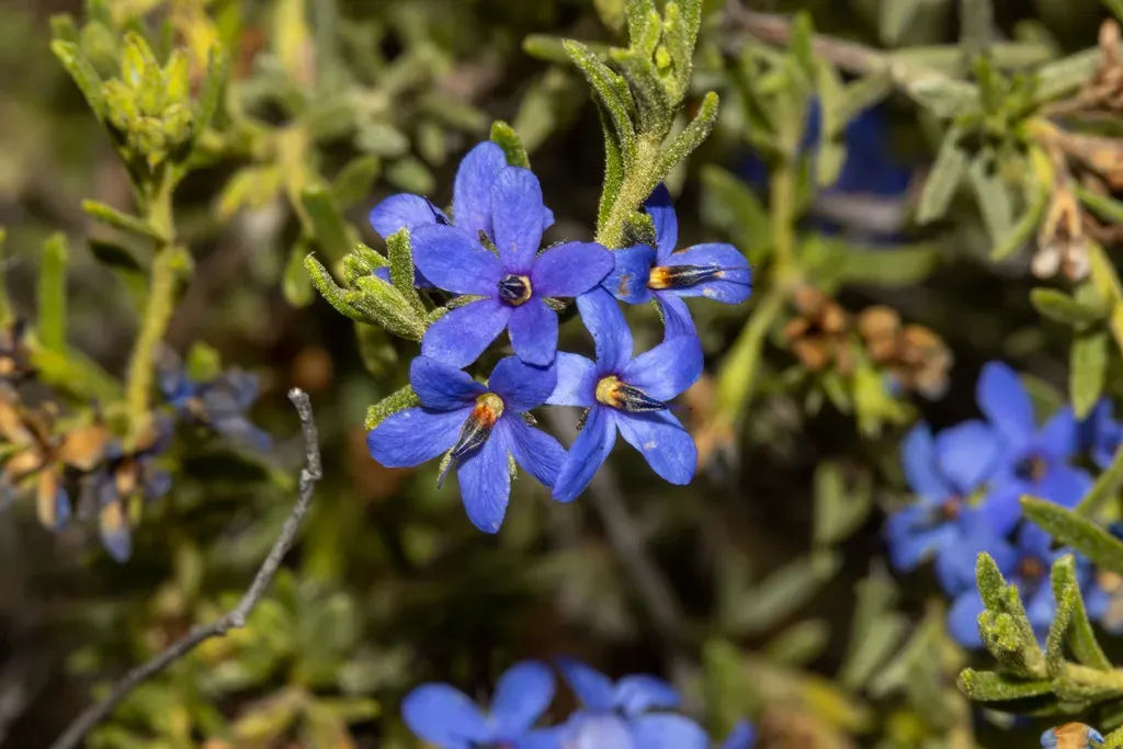 Halgania cyanea is a small perennial shrub known for its dull green leaves and blue flowers, native to Australia.