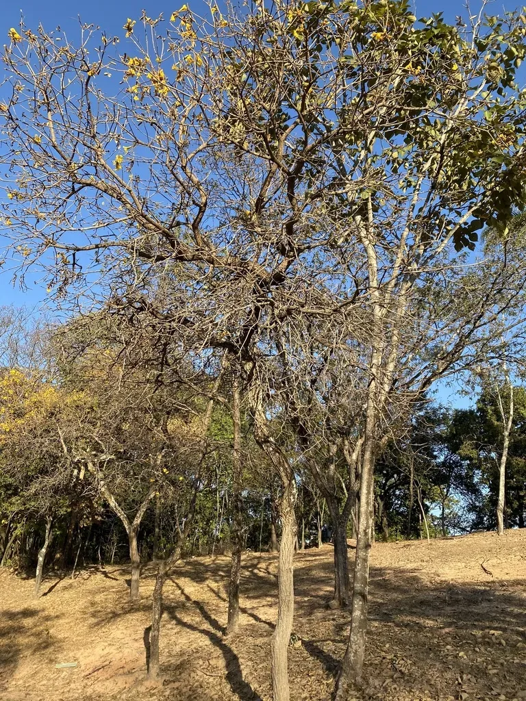 Handroanthus ochraceus is a deciduous tree known for its bright yellow trumpet-shaped flowers and wide spreading crown.