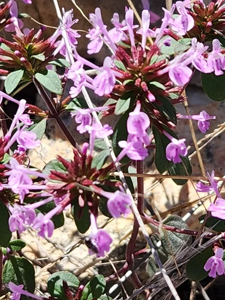 Hedeoma acinoides is a perennial herb native to arid regions of northeastern Mexico and Texas, characterized by its slender erect stems and small clustered flowers.