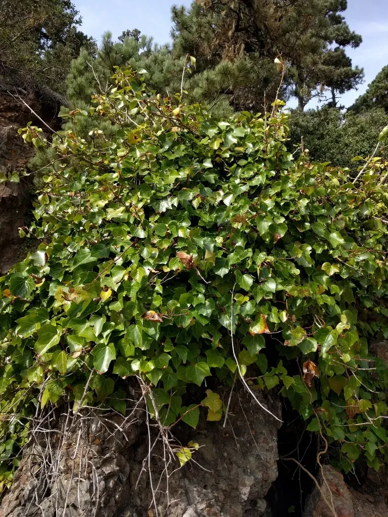 Hedera canariensis is a climbing evergreen woody vine with large, lobed leaves, often used as groundcover or for climbing on walls and trees.