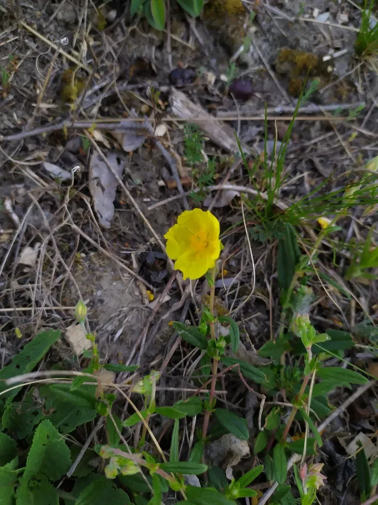 Helianthemum nummularium is a low-growing, woody-stemmed evergreen shrub-like plant with small oval grey-green leaves and bright yellow flowers.