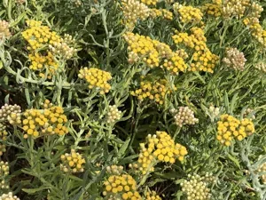 A bushy, grey-woolly shrub with yellow, straw-like flowers native to southern Africa.