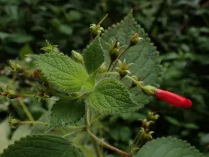 Heppiella ulmifolia is a subshrub or shrub native to wet tropical regions, known for its simple, elongated glossy green leaves and distinctive flowers.