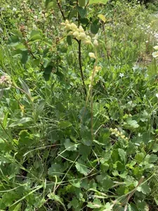 Heuchera cylindrica is a perennial herbaceous plant native to the northern Rocky Mountains and western North America, known for its rounded, scalloped green leaves and tall spikes of small white to greenish flowers.