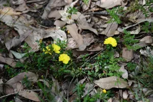 Hibbertia diffusa is a small, spreading perennial shrub or groundcover native to southeastern Australia, known for its glossy dark green leaves and bright yellow flowers.