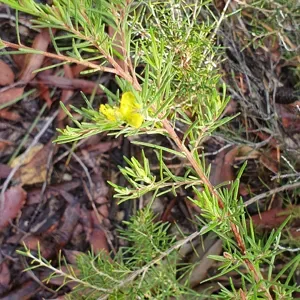 Hibbertia stricta is a small shrub native to Australia, characterized by hairy foliage, linear leaves, and yellow flowers with multiple stamens.