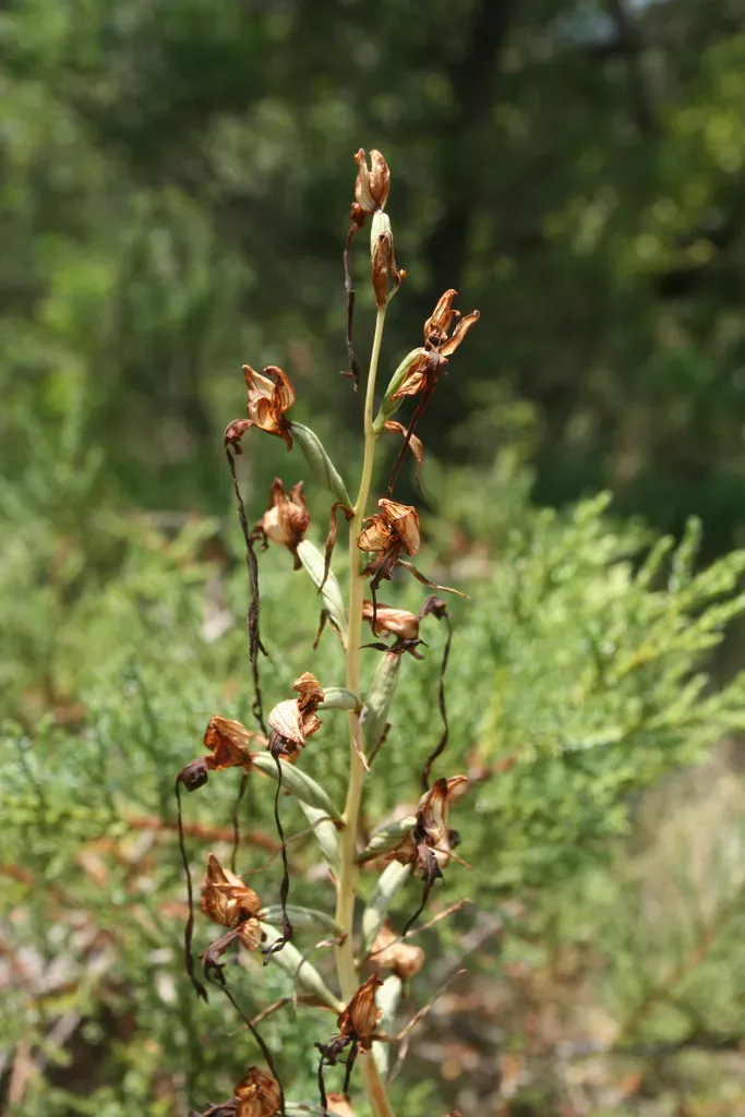 Himantoglossum caprinum is a tuberous orchid species native to southeastern Europe and the Middle East, known for its distinctive elongated flowers.