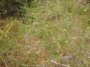 An upright shrub with wand-like branches, aromatic foliage, and white to pink flowers in small clusters at the ends of branches.