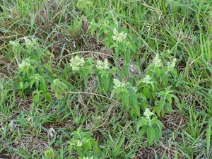 Hoslundia opposita is a hardy, evergreen, small to medium-sized shrub or perennial herb with aromatic leaves and small creamy-green flowers, producing fleshy, orange berry-like fruits.