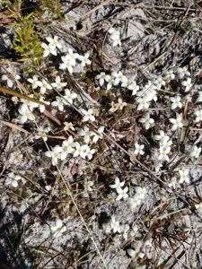 Houstonia procumbens is a low-growing, perennial herbaceous plant with small white flowers and a procumbent spreading habit.