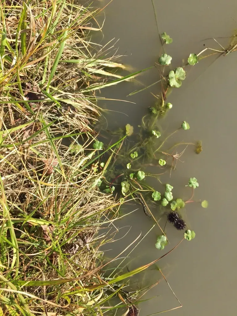 Hydrocotyle ranunculoides is a perennial aquatic plant known for its creeping stoloniferous stems and round, kidney-shaped leaves that float on or protrude above water surfaces.