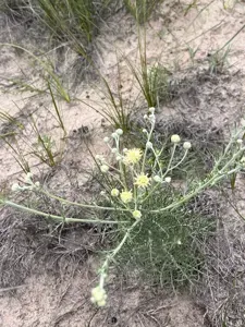 Chalk Hill Hymenopappus (Hymenopappus Tenuifolius) is a biennial herb in the Asteraceae family with easy care difficulty. It requires low watering and full sun light in USDA hardiness zones 5-9. This plant is safe for cats and dogs.