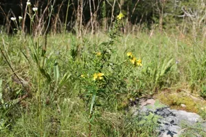 Hypericum sphaerocarpum is a semi-woody perennial herbaceous plant native to North America, known for its bright yellow flowers and shrubby appearance.