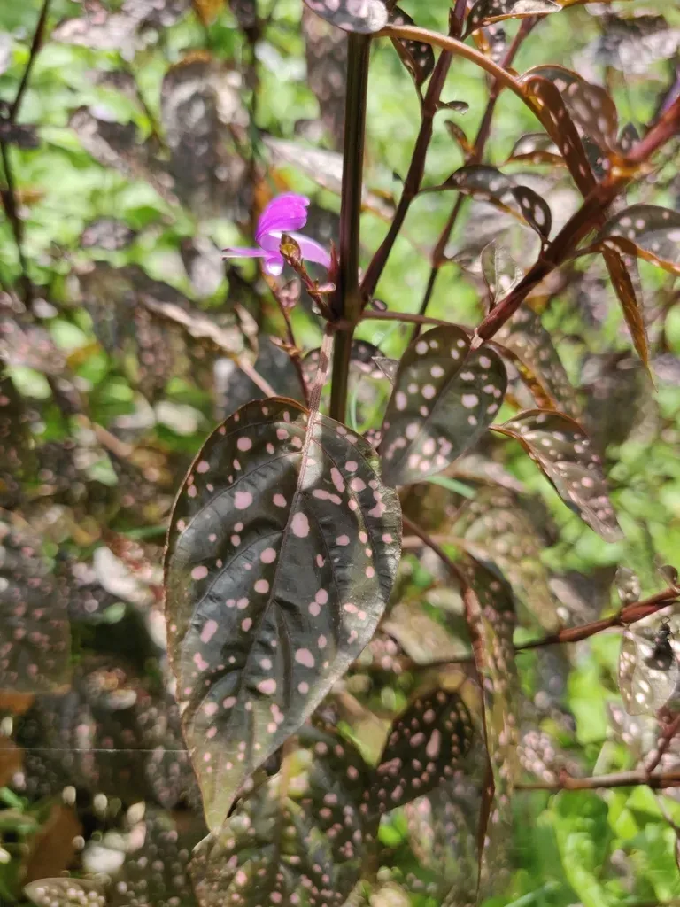 Hypoestes phyllostachya, commonly known as the Polka Dot Plant, is a small, colorful herbaceous perennial native to Madagascar, prized for its spotted foliage.