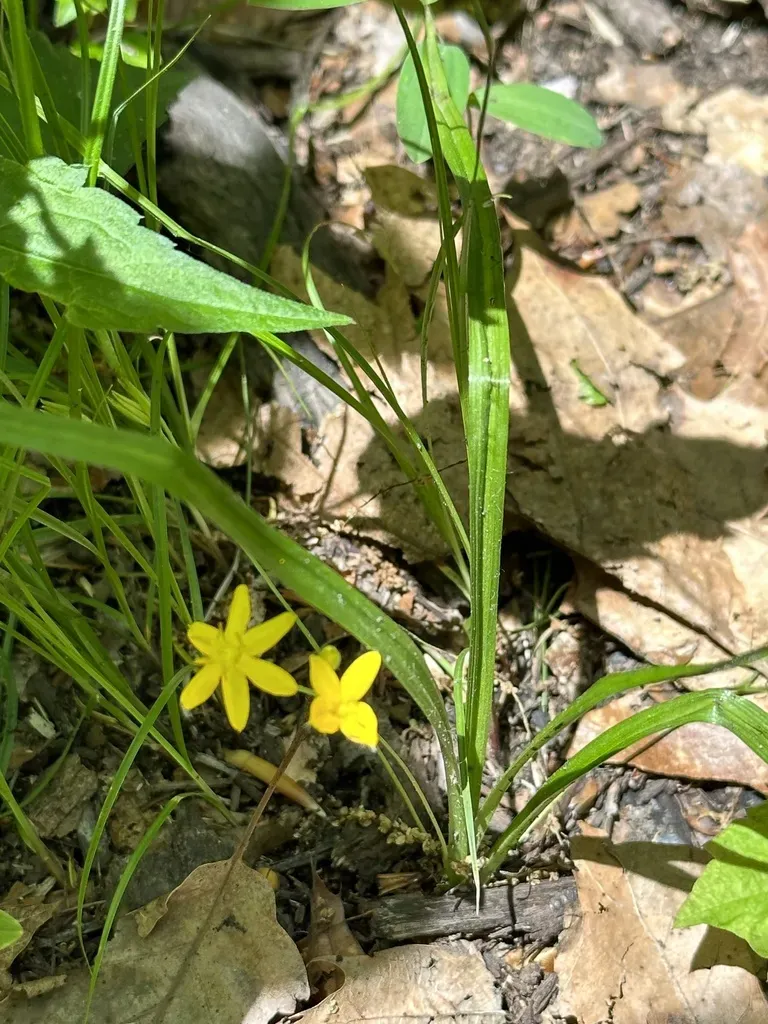 A small perennial wildflower with grass-like leaves and bright yellow star-shaped flowers.