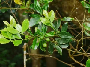 A dense, upright, evergreen shrub or small tree with small, rounded, glossy green leaves and tiny white flowers in spring.