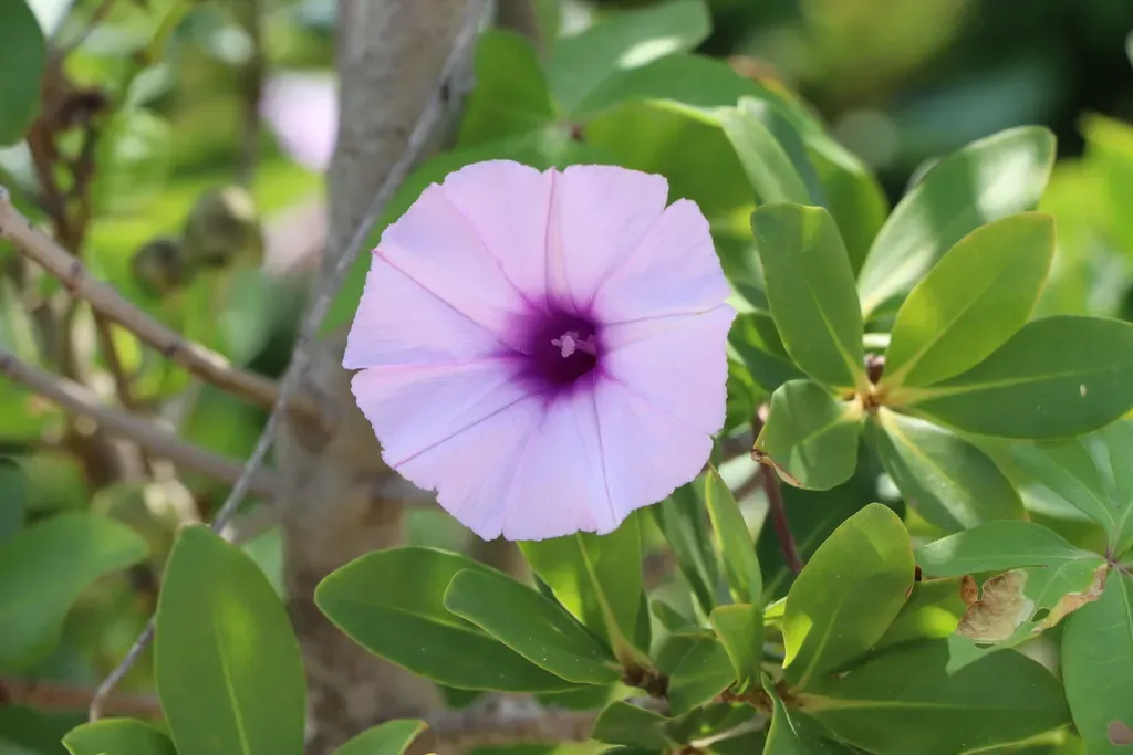 Ipomoea cairica is a fast-growing perennial climber with palmate leaves and showy white to lavender funnel-shaped flowers.