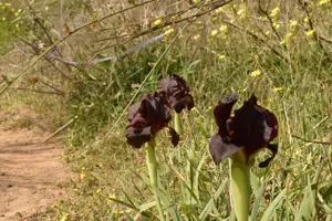 Iris atropurpurea is a rhizomatous perennial native to Israel and Palestine, known for its large velvety dark purple to black flowers and glaucous, sickle-shaped leaves.