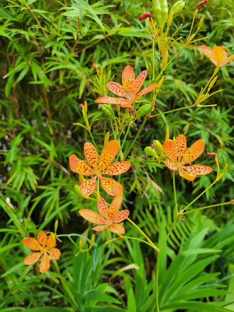 Iris domestica, commonly known as blackberry lily or leopard lily, is a perennial plant with striking orange flowers spotted with red and unique seed pods resembling blackberries.
