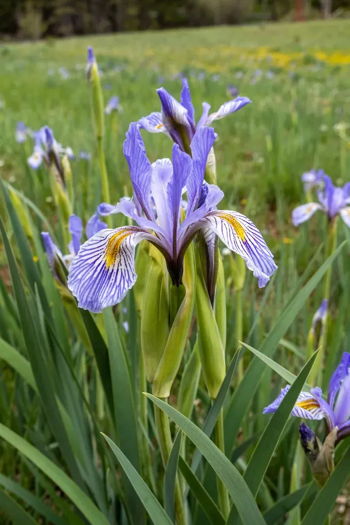 Iris missouriensis is a rhizomatous perennial native to western North America, known for its large, delicate pale blue to lavender flowers often with purple veins.