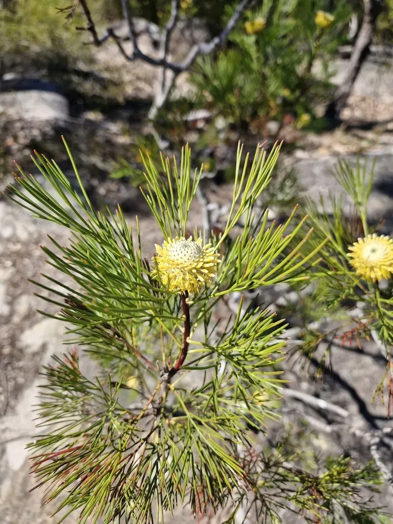 Isopogon anethifolius is an erect shrub native to eastern Australia, known for its divided leaves and prominent yellow flower heads.