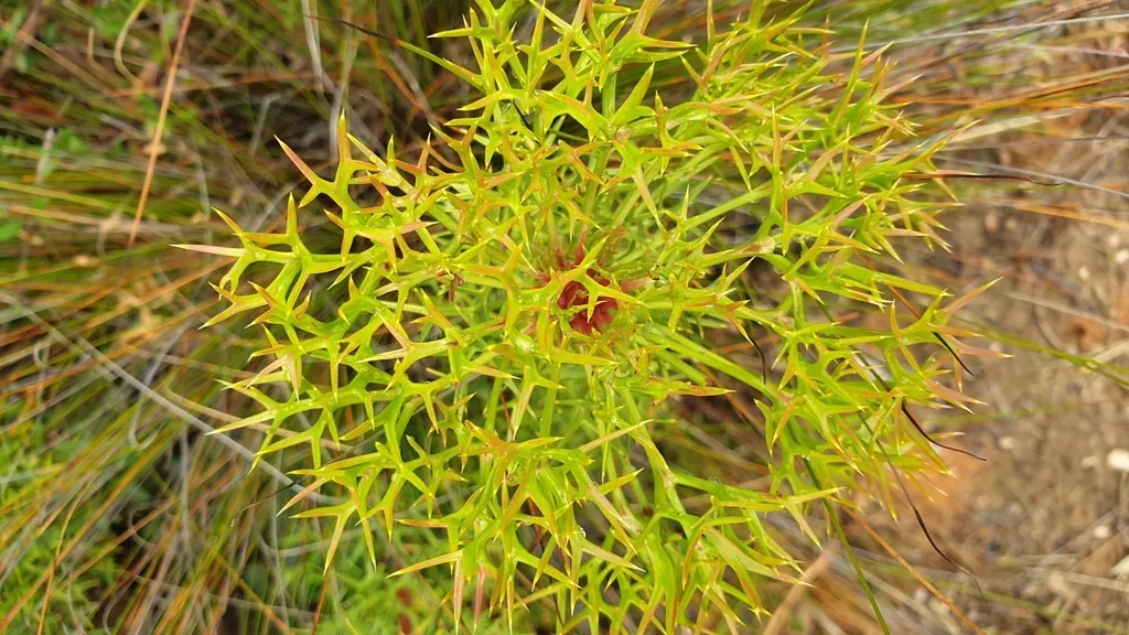 Isopogon ceratophyllus is a small woody shrub native to Australia, known for its prickly foliage and cone-like flower heads.