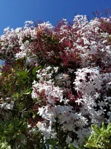 A vigorous evergreen climbing vine known for its abundant, fragrant white flowers with pink buds.
