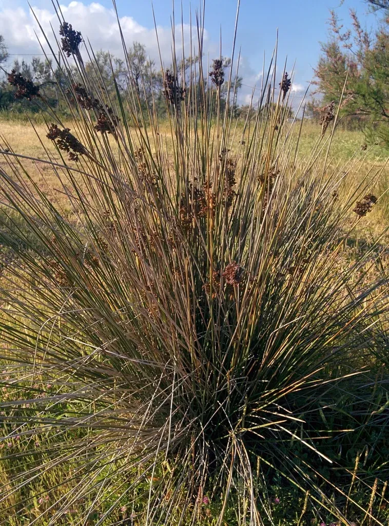 Juncus acutus is a perennial, grass-like herb known for its sharp, spiny leaves and clump-forming growth habit.