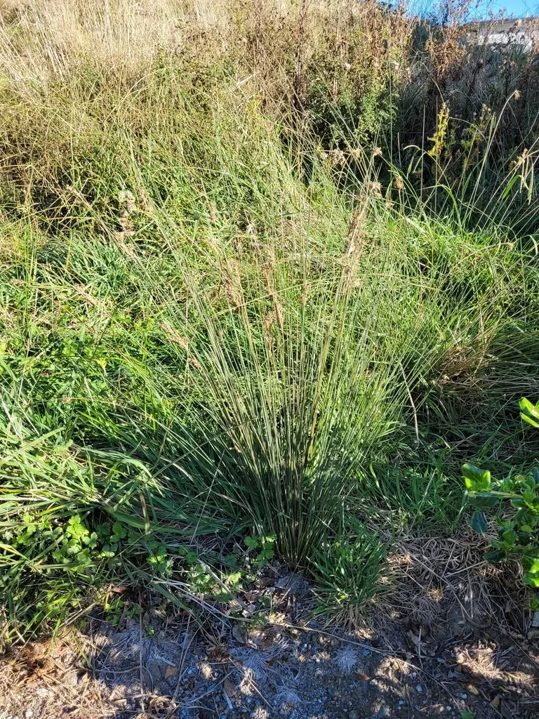Densely tufted, tussock-forming, dull blue-green perennial herb with erect stems that droop in the upper parts.