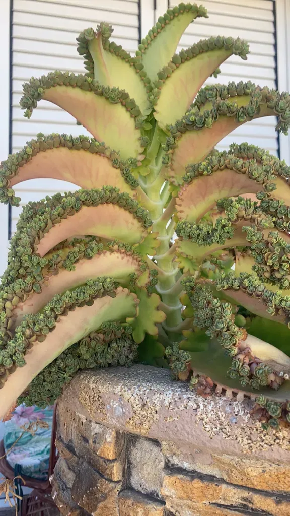 Kalanchoe laetivirens is a succulent plant known for its large, upright, triangular leaves with plantlets growing along the edges.